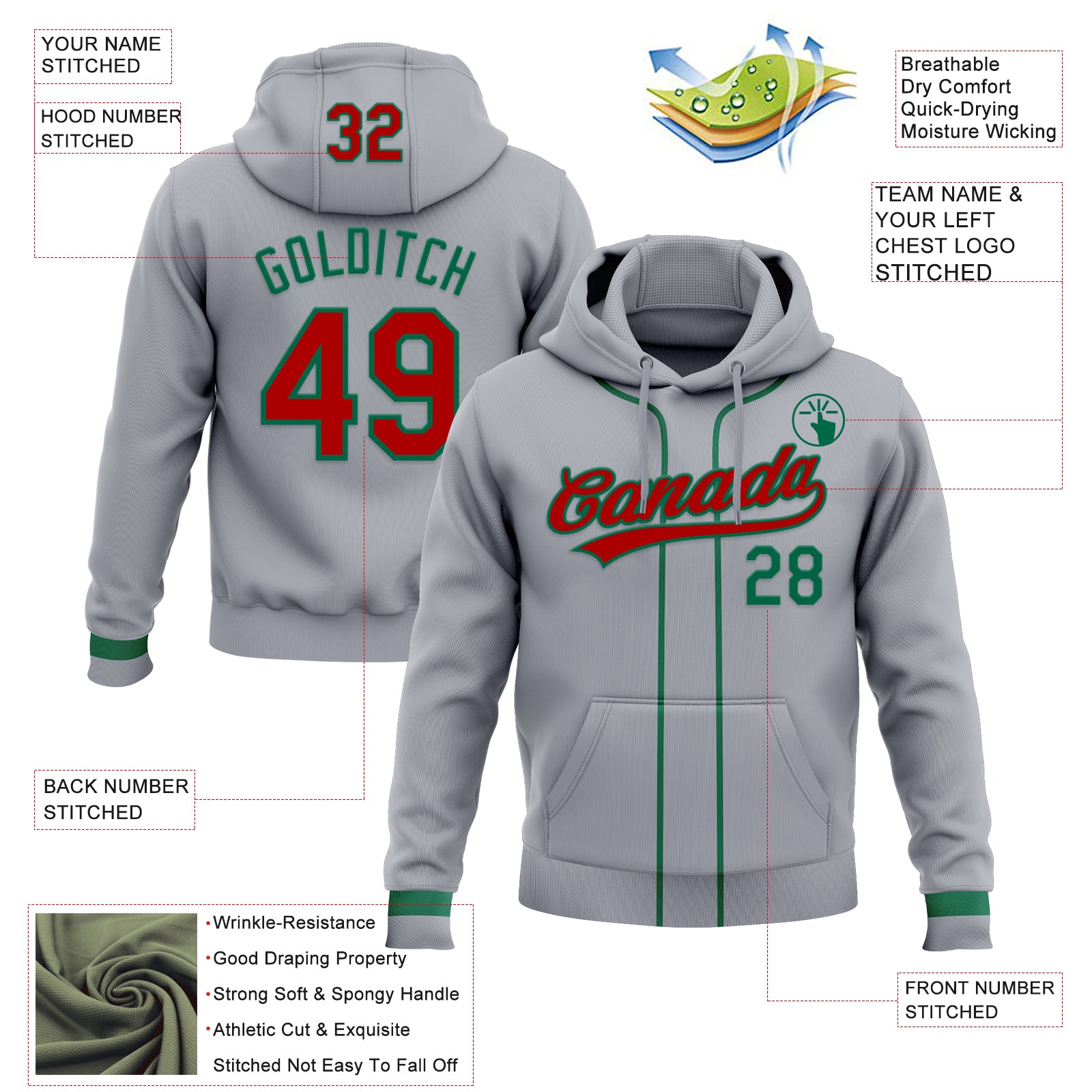 Custom Stitched Gray Red-Kelly Green Baseball Pullover Sweatshirt Hoodie