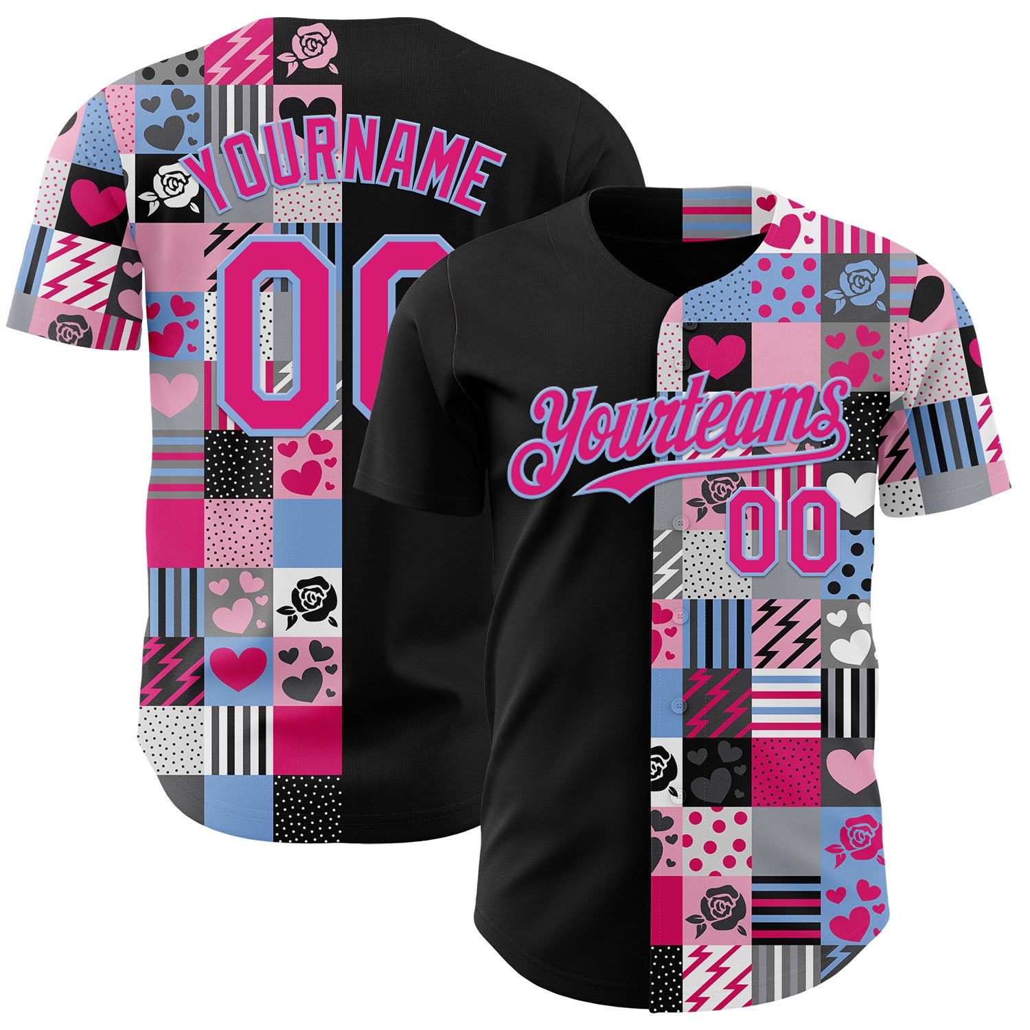 Custom Black Hot Pink-Light Blue Valentine's Day Love Heart Authentic Baseball Jersey