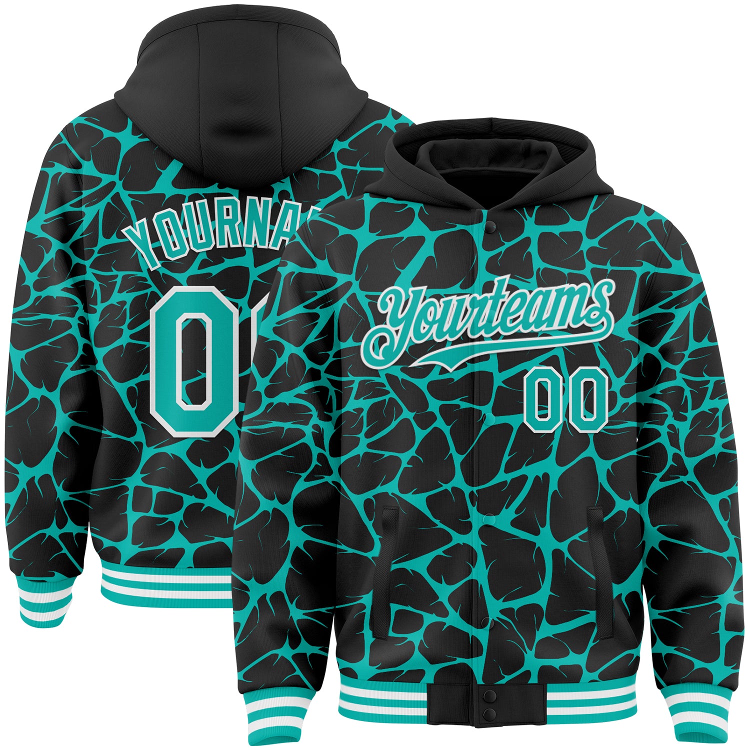 Custom Black Aqua-White Abstract Network 3D Pattern Design Bomber Full-Snap Varsity Letterman Hoodie Jacket