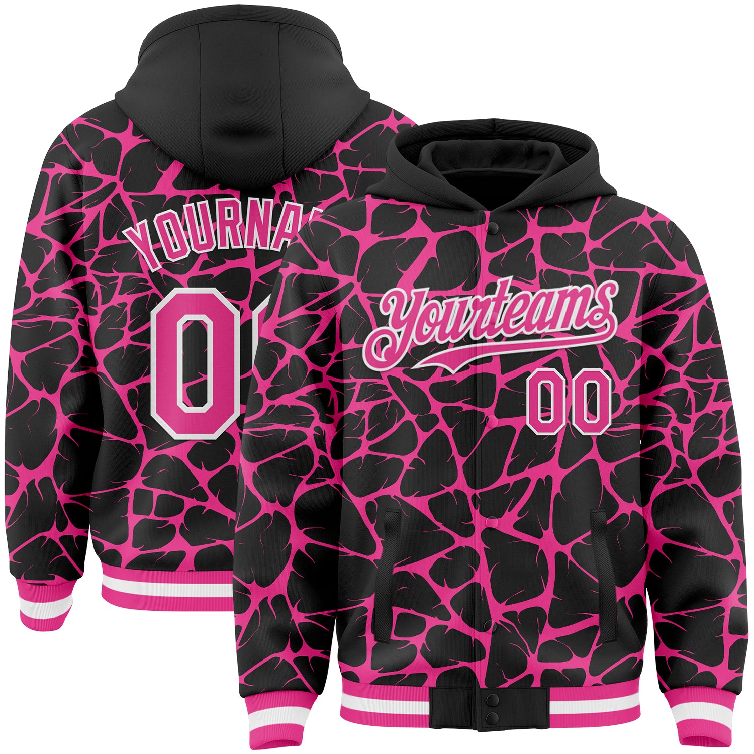 Custom Black Pink-White Abstract Network 3D Pattern Design Bomber Full-Snap Varsity Letterman Hoodie Jacket