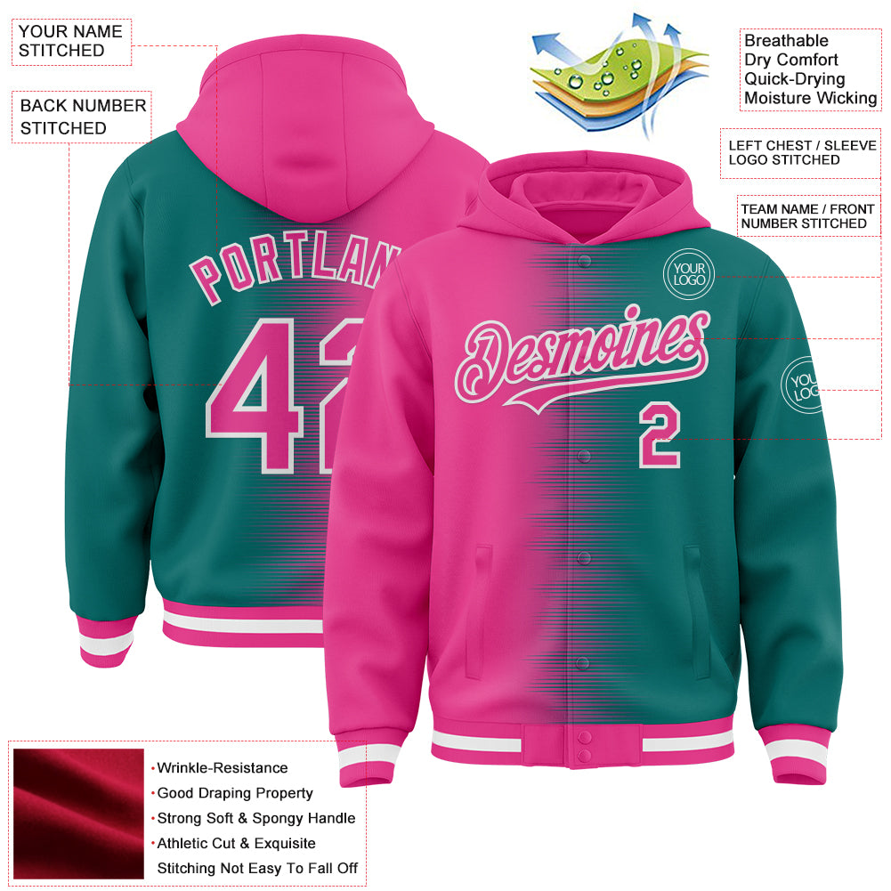 Custom Pink Teal-White Gradient Line Bomber Full-Snap Varsity Letterman Hoodie Jacket