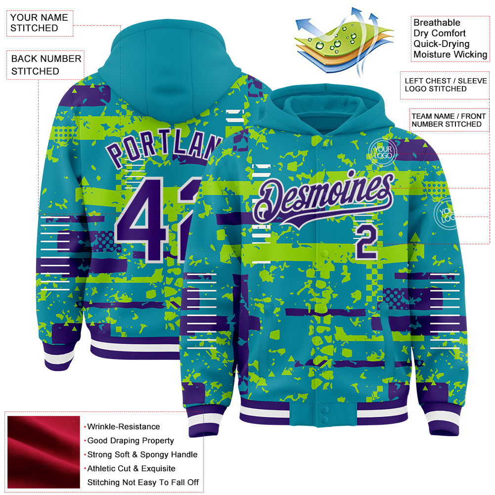 Custom Teal Purple Neon Green-White Abstract Fragment Shape 3D Pattern Design Bomber Full-Snap Varsity Letterman Hoodie Jacket
