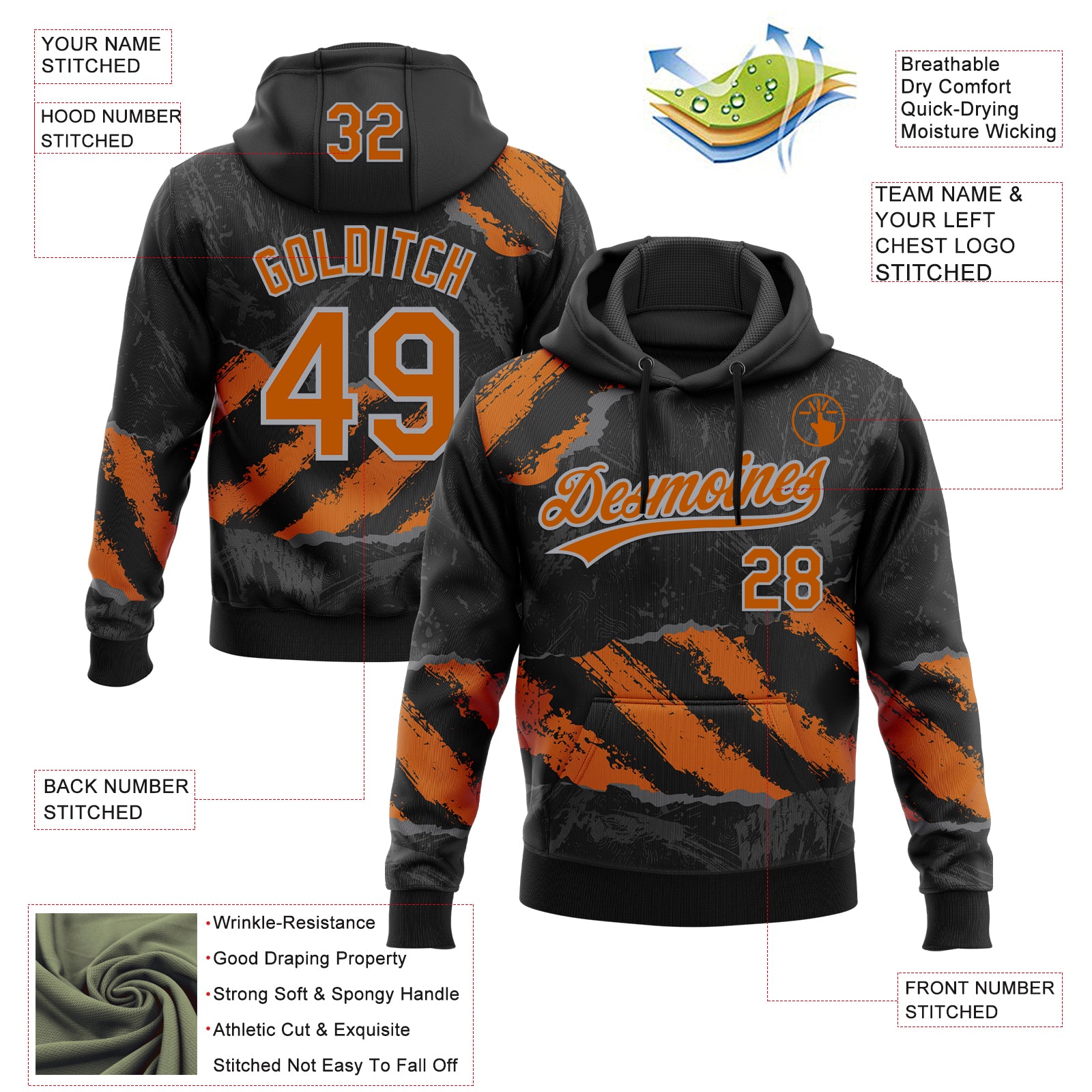 Custom Stitched Black Texas Orange Steel Gray-Gray 3D Pattern Design Splash Sports Pullover Sweatshirt Hoodie