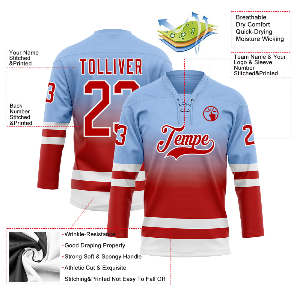 Custom Light Blue Red-White Fade Fashion Hockey Lace Neck Jersey
