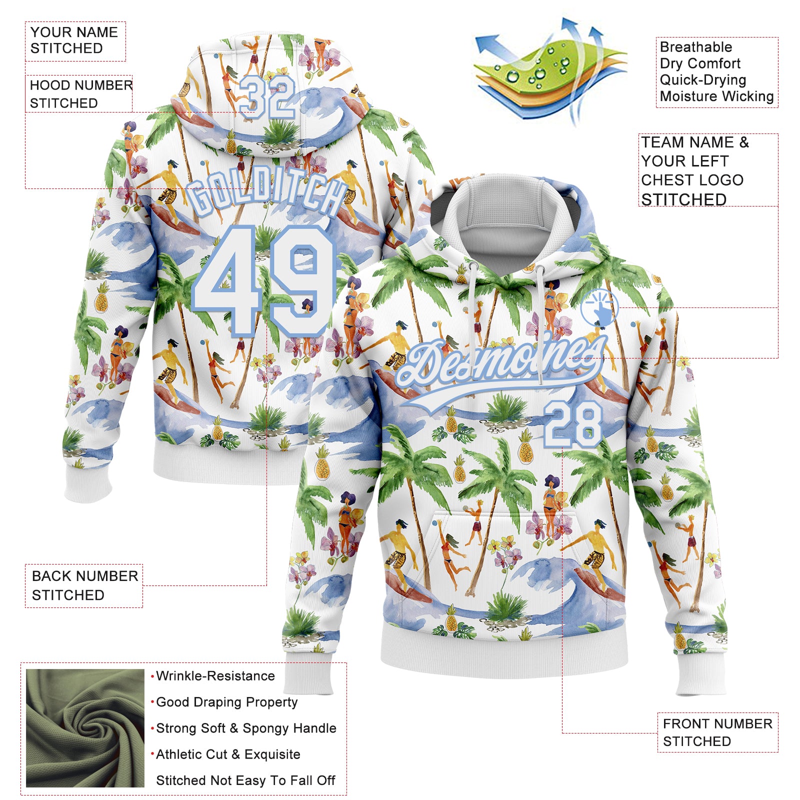Custom Stitched White Light Blue 3D Hawaii Palm Trees Sports Pullover Sweatshirt Hoodie