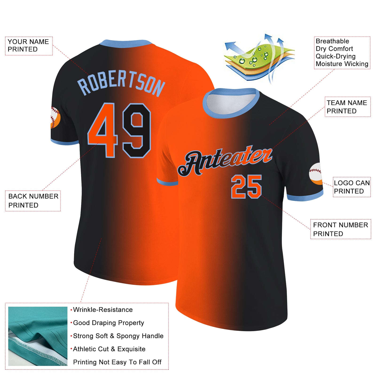 Custom Black Orange-Light Blue Gradient Fashion Performance T-Shirt