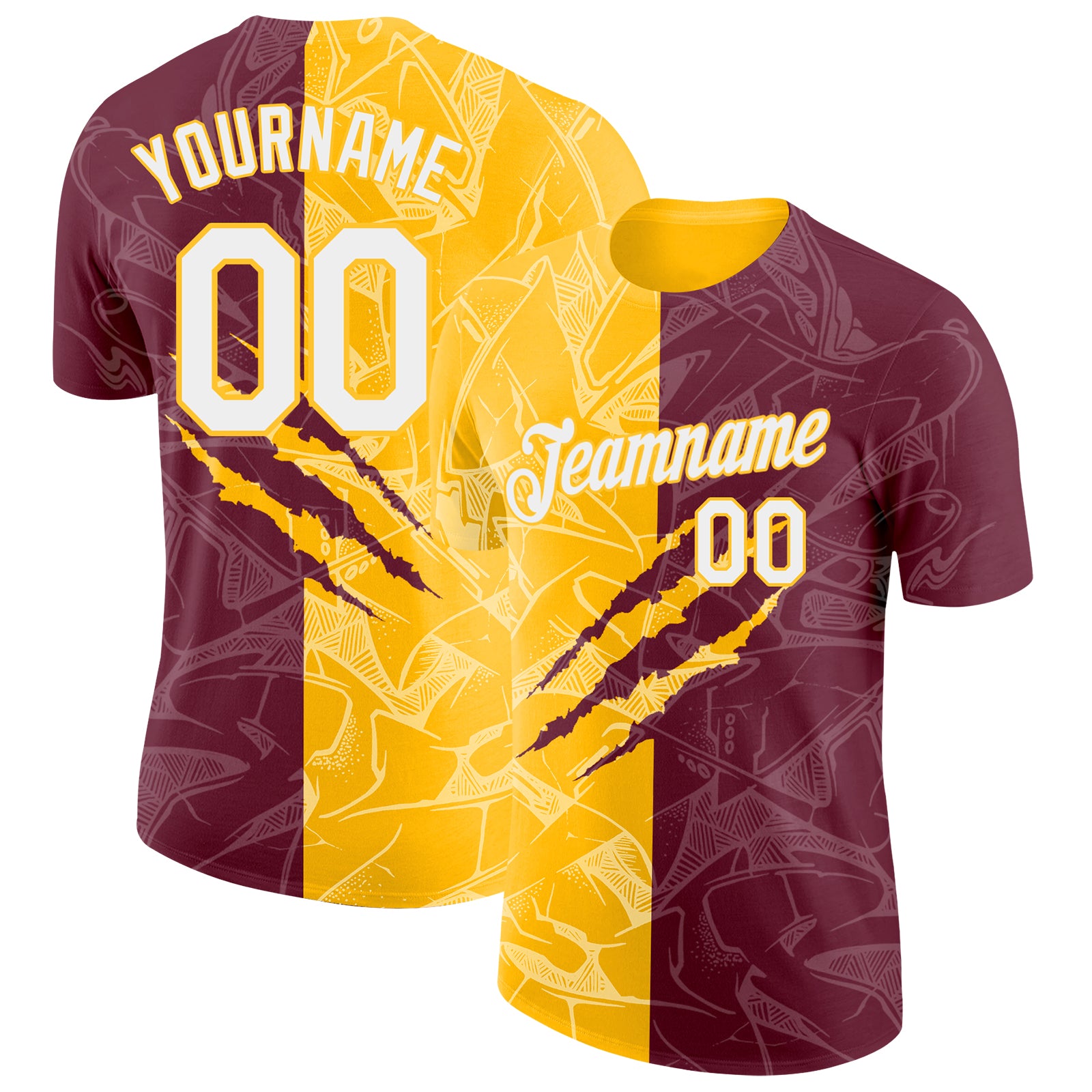 Custom Graffiti Pattern White Burgundy-Gold Scratch 3D Performance T-Shirt