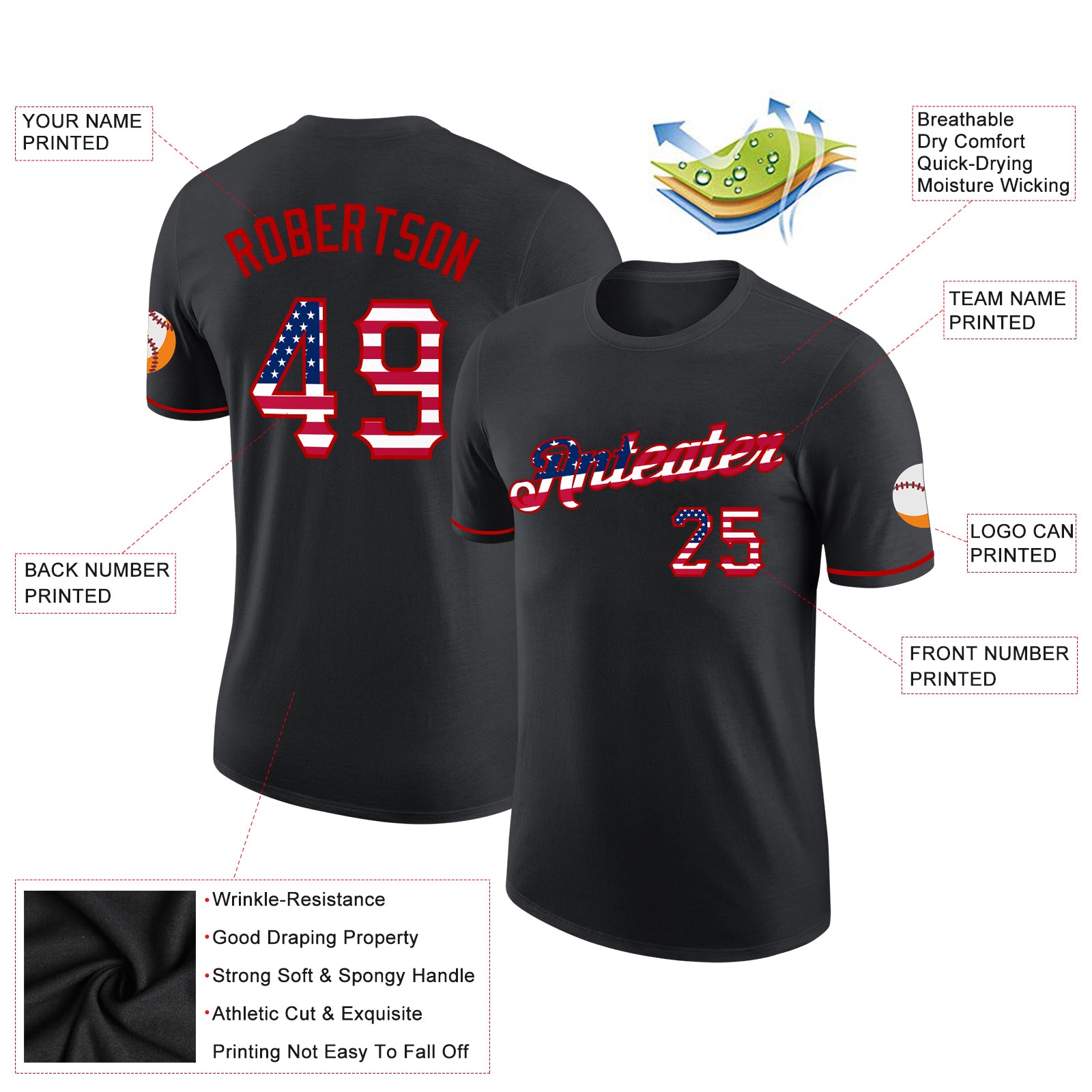 Custom Black USA Flag-Red Performance T-Shirt