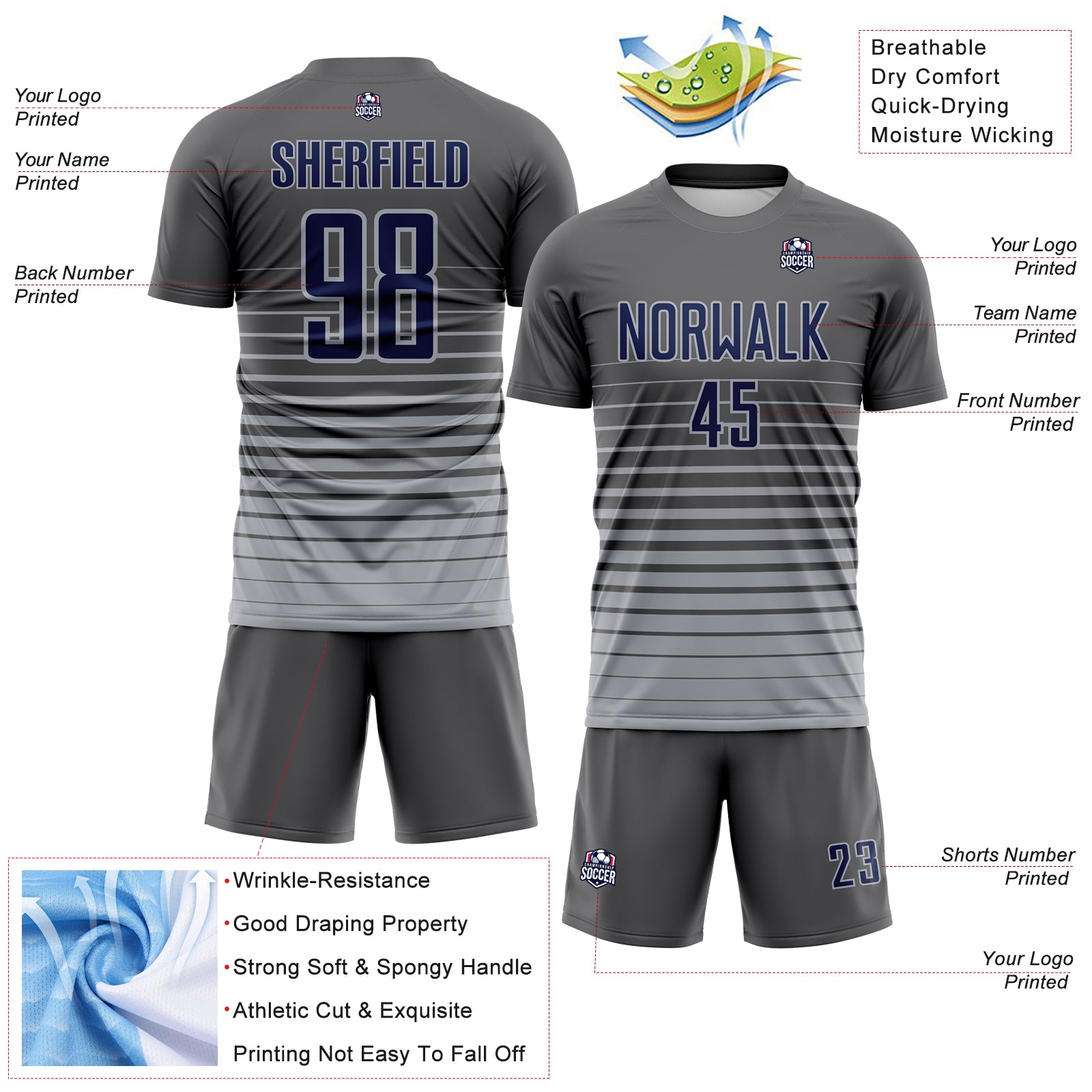 Custom Steel Gray Navy-Gray Gradient Pinstripe Sublimation Soccer Uniform Jersey