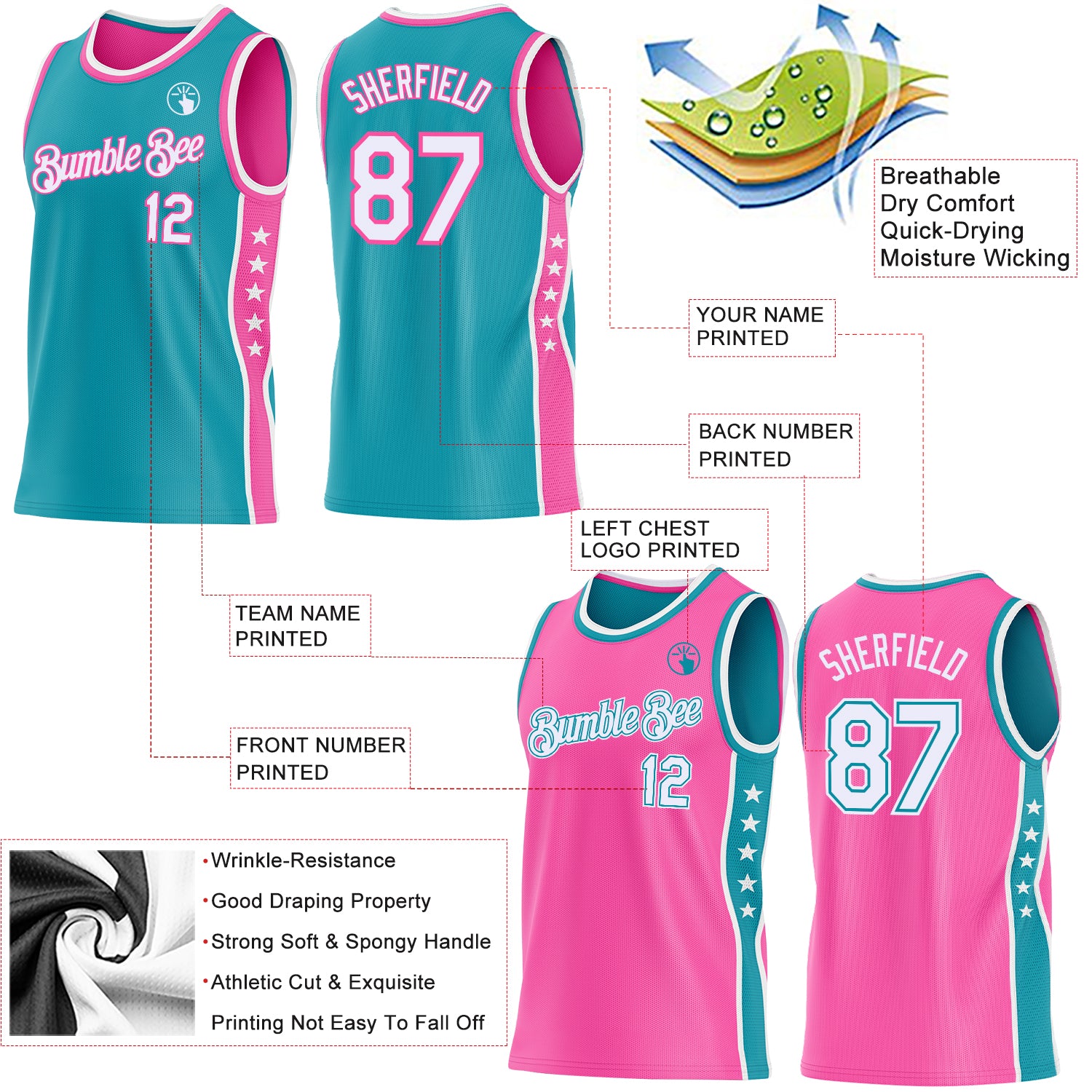 Custom Reversible Teal White-Pink Double Side Star Sublimation Basketball Suit Jersey