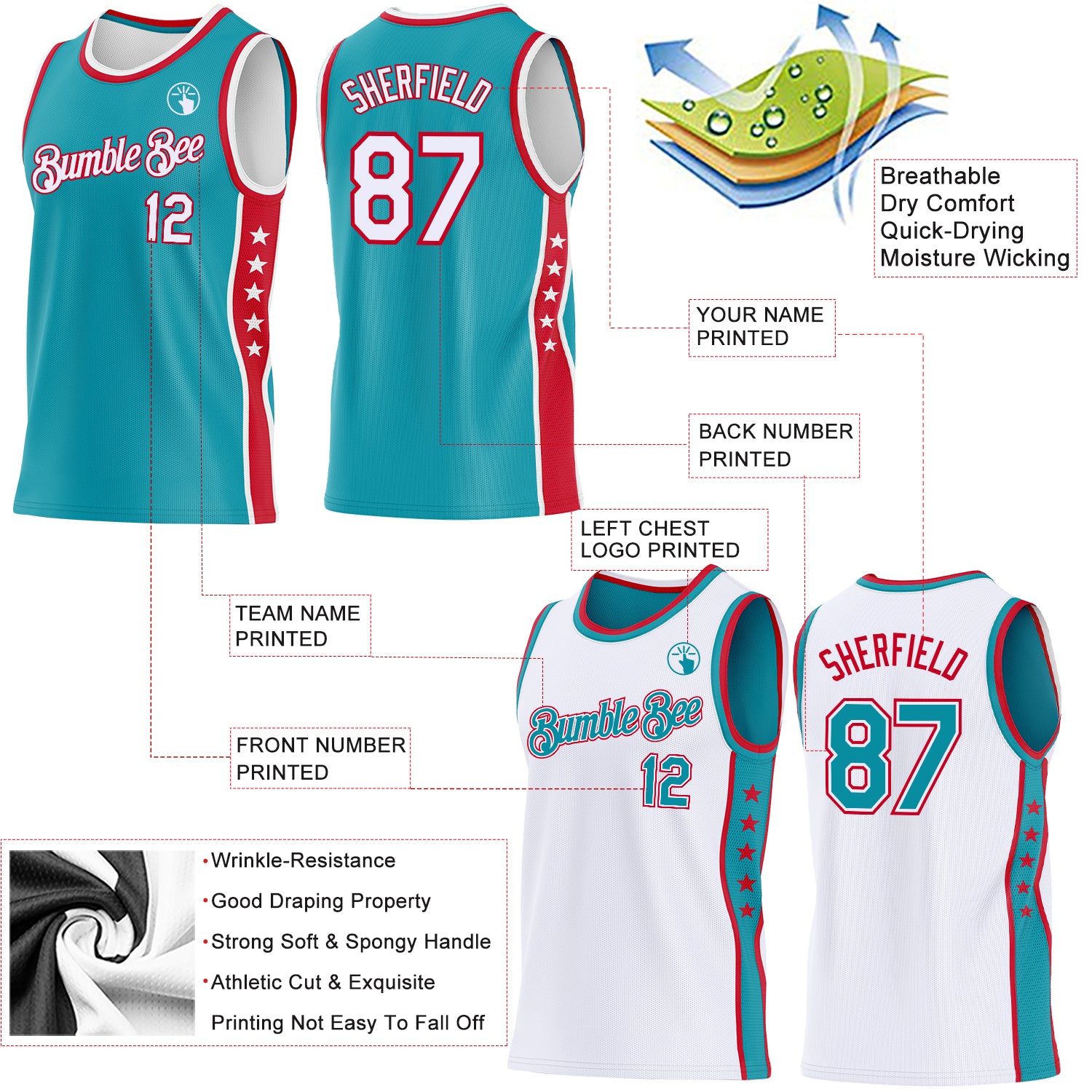 Custom Reversible Teal White-Red Double Side Star Sublimation Basketball Suit Jersey
