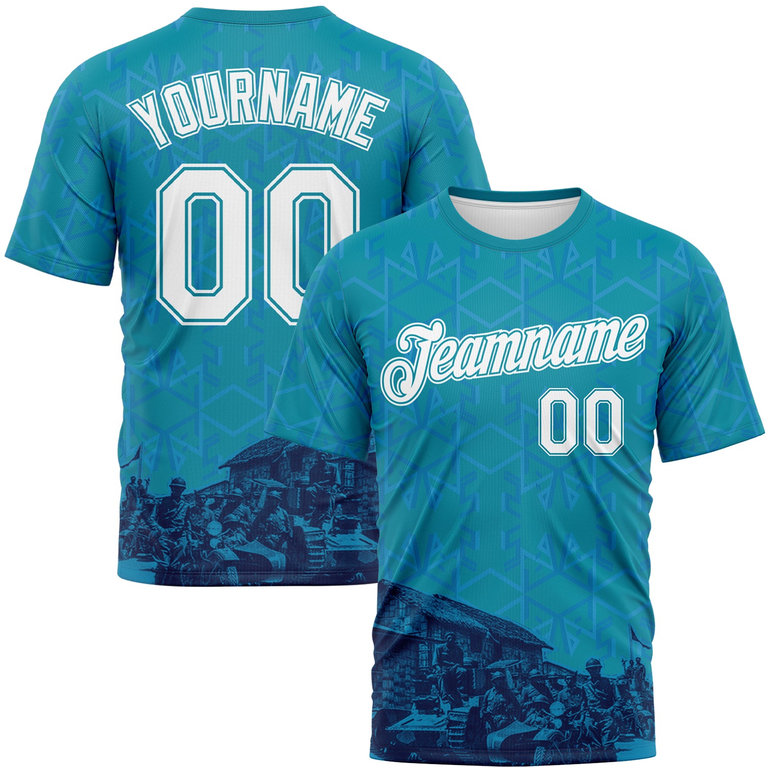 Custom Teal-White Geometric Military Vibe Performance T-Shirt