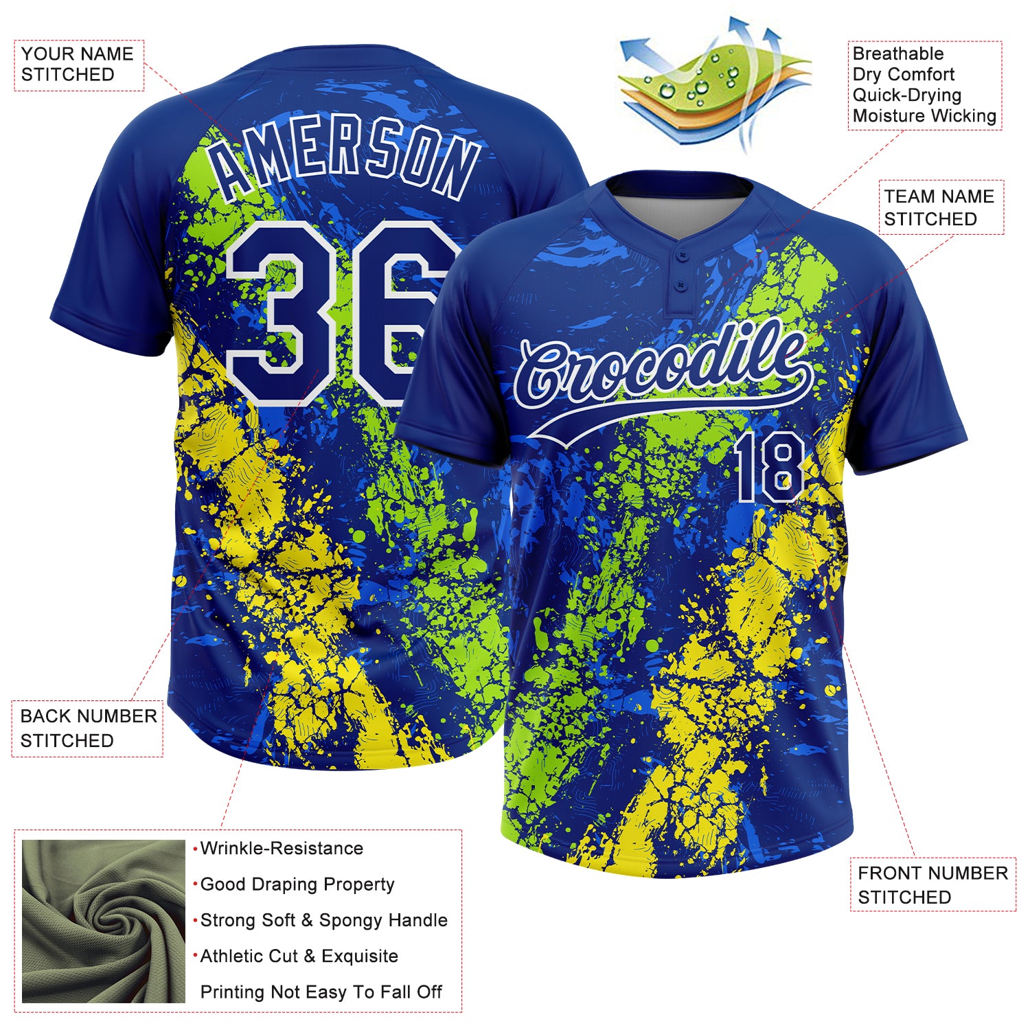 Custom Royal Neon Green Light Yellow-White Dripping Splatter Cracked Texture Two-Button Unisex Softball Jersey